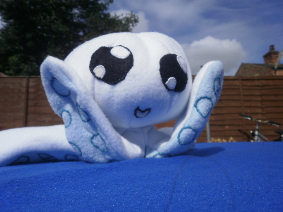 This is a plushie of squiddly who is chillin' in my garden, and its a surprisingly sunny day.