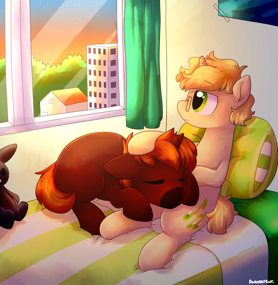 Just some cute drawing that came to my mind. Mellow pretended to fall asleep on Shining's laps and is now a blushy but happy mess. On his side, Shining doesn't seem to mind and deep inside, he's pretty glad his friend did that.