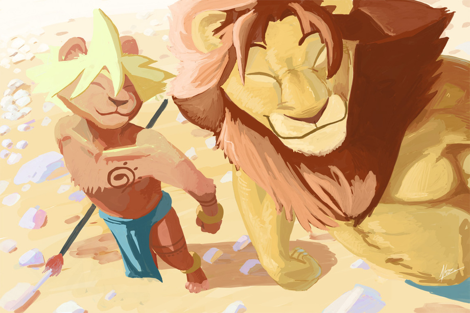 We cats usually only smile like that when we are up to something, or we just beat up a mouse.  :)   I love this pic for so many reasons.  It is well drawn, the colours are warm and cheerful, and who can look at this pair and not smile along with them?