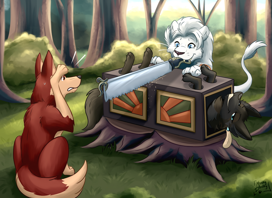 I was pleased when I heard I'd won Aqua's raffle. So I came up with this fun scenario of Maskelyne entertaining his worried friend Bandit with the illusion of sawing a canine in half, Aqua happily obliged to assist :D