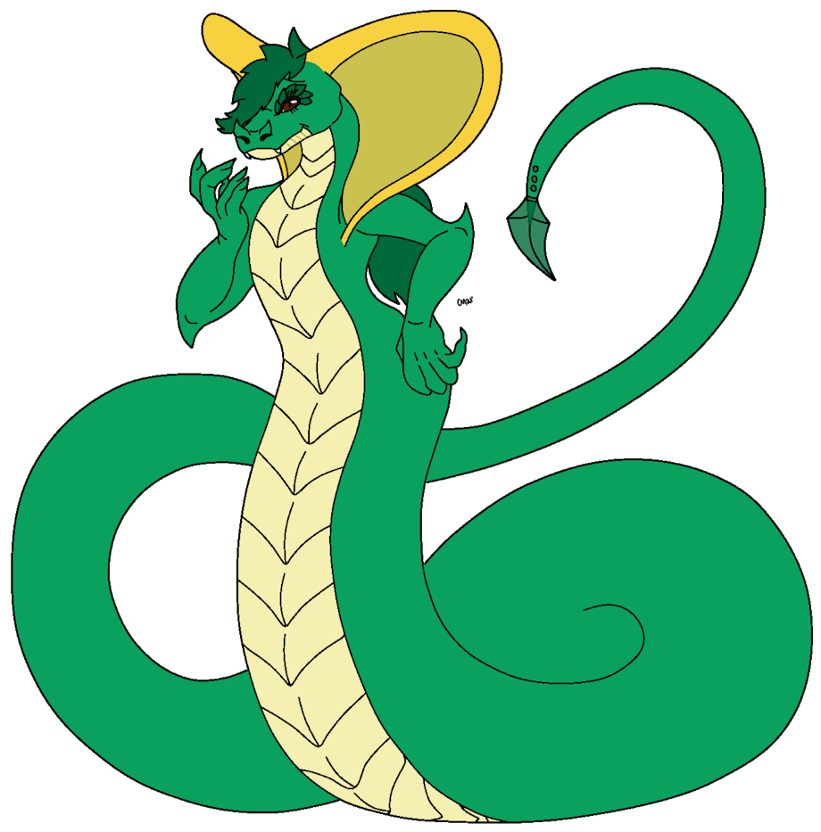 Info: It is a green cobra with huge Dark Green hair, the aura of its eyes are brown, its tail has 4 piercings and an Iron Stinger or piece of Spear, it has two huge protruding fangs + a small tooth in the middle. Saharay is similar to Taila Fox in having a second form which is Android Saharay.