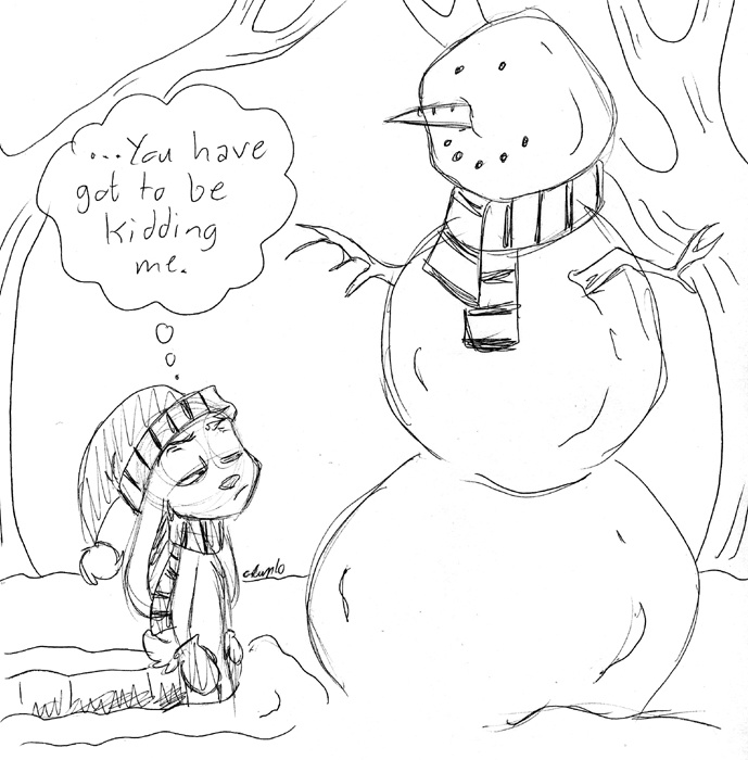 In this piece, we find out that some pesky faun had stolen Tristan's yummy carrot from the fridge and used it for a snowman's nose. Tristan shows his feelings about that so well, as seen here...