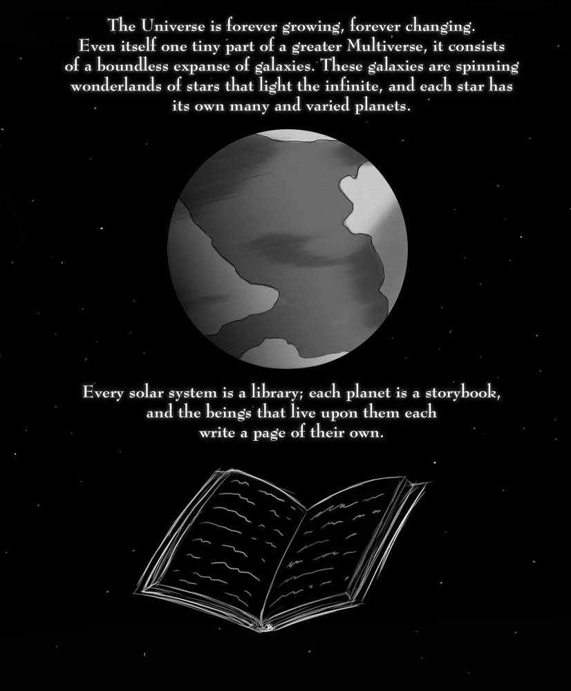 I always envisioned the intro lasting a good 5 minutes, and with a narrator instead of a text crawl, over a series of detailed watercolors that show the universe, the galaxy, system, planet, etc. then illustrate various bits and pieces of the history as they come up in the narration. Music would be something less Williams-y, and more this style.