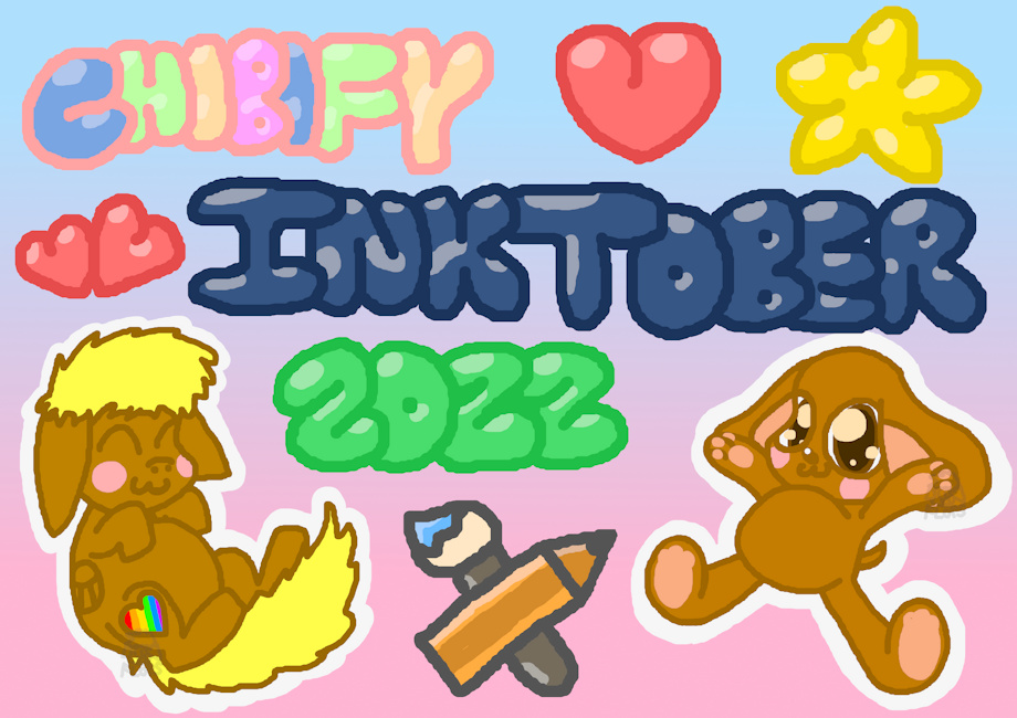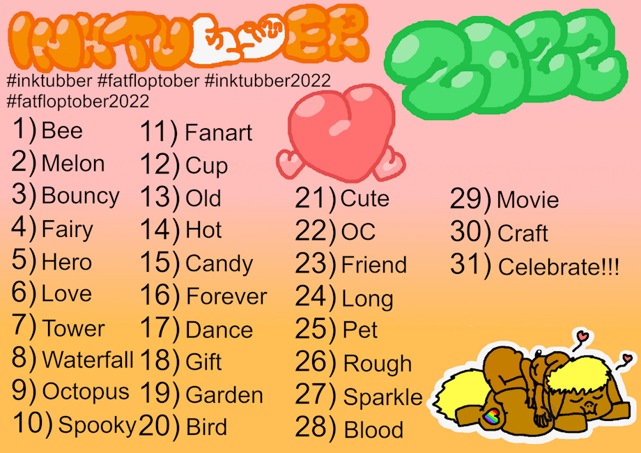I made my own Inktober prompt list with a chubbyi art theme. I want to spread love for those thicker peeps coz fat shaming is terrible :C I also made a blank template so you can make your own prompts if you want. My fav entriee who finishes either mine or their own prompts with my hashtags will get a free chubby art by me of whatever you want :3 Please share this around and consider joining in to share the love <3 (This is also on Instagram, DeviantArt and Furaffinity)