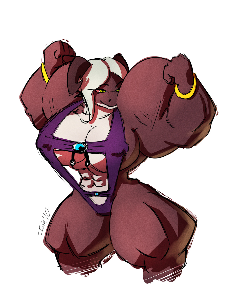 From the moment I conceptualized her, Pachua was destined to be, as I dubbed her, the Bicep Queen. She can flex em huge, to say the least! Also, that was her early established outfit for a while. Of course, I think we can all agree that no sleeves can contain arms that big. ;)