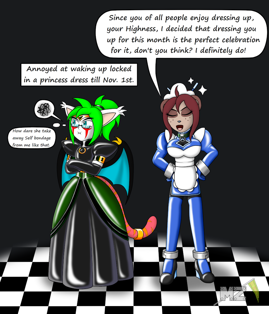 A for fun pic I did of Prince Zaki waking up locked in his Princess dress by Maid Dryad. And Being a Pouty Princess boi about no getting to lock himself in it this year. Side note this is the first time I ever drew a character Pouting. and I plan on making a Part 2 to this in my free time.