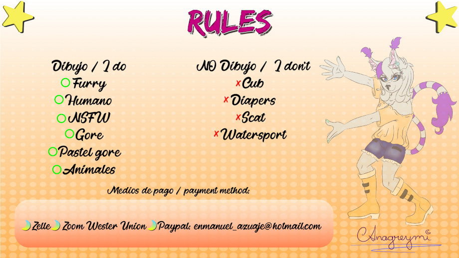 1) If you want a commission send my a messegage private to my inkbunny. Also, you can talk with me in Discord, Facebook and Gmail.