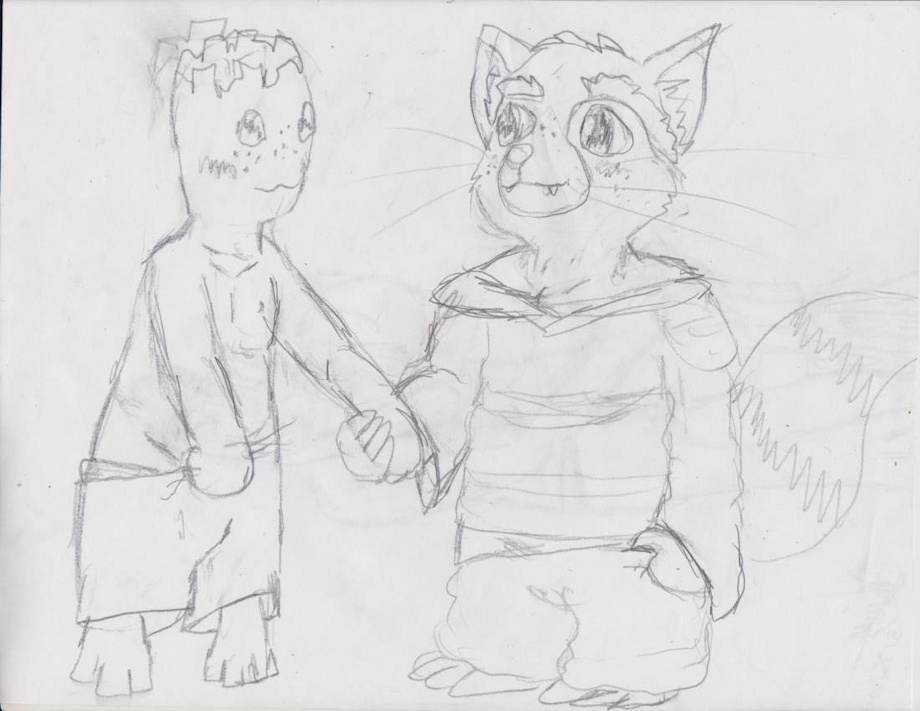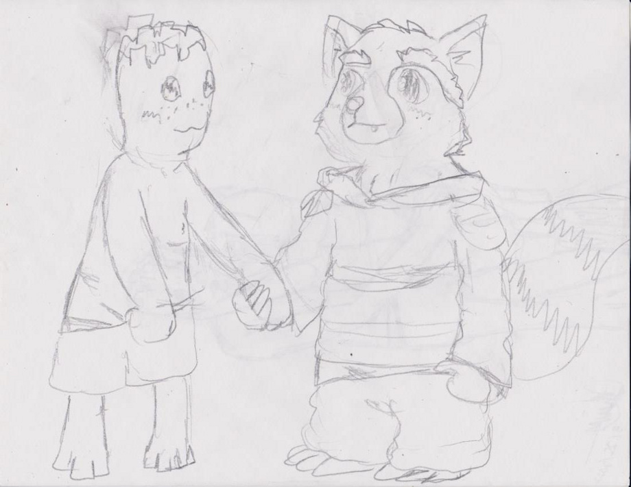 -3- En la tercera imagen, Rocket se habrá dado cuenta de que también se está volviendo más joven, en la imagen anterior solo es un poco más joven desde el principio, pero ahora se habrá vuelto significativamente más joven. ¡El mapache ha vuelto a ser un adolescente! ¡Groot también se ha vuelto mucho más joven, se ha convertido en un niño y ahora él y Rocket están casi a la misma altura! Rocket está en el suelo ahora, Groot es demasiado pequeño para sostenerlo más. Sus alturas ahora iguales son muy obvias con ellos de pie uno junto al otro. Ambos están muy conmocionados por su situación. Groot es tímido acerca de su relación romántica ahora y me gustaría que sostenga la mano de Rocket mientras se sonroja, y Groot está usando su otra mano para sostener sus pantalones cortos, ya que son aún más holgados y holgados en esta etapa. Groot ha perdido sus granos, pero también ha perdido la mayor parte de su musgo y vello corporal, sus enredaderas y hojas en su cabeza son mucho más cortas y de aspecto más juvenil. El rostro de Groot es redondo e infantil, todo rastro de su edad adulta ha desaparecido de sus rasgos y su expresión. Mientras tanto, Rocket se mira hacia abajo, él también tiene granos y una cara y un cuerpo más delgados y mucho menos varoniles. En general, se ve desgarbado y sorprendido por su regresión y la de Groot. El mono de Rocket le queda bastante suelto ahora, tal vez su hombro casi sobresale por el agujero del cuello.