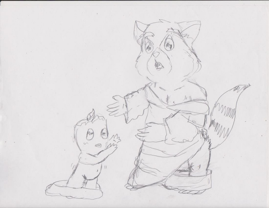 -3- En la tercera imagen, Rocket se habrá dado cuenta de que también se está volviendo más joven, en la imagen anterior solo es un poco más joven desde el principio, pero ahora se habrá vuelto significativamente más joven. ¡El mapache ha vuelto a ser un adolescente! ¡Groot también se ha vuelto mucho más joven, se ha convertido en un niño y ahora él y Rocket están casi a la misma altura! Rocket está en el suelo ahora, Groot es demasiado pequeño para sostenerlo más. Sus alturas ahora iguales son muy obvias con ellos de pie uno junto al otro. Ambos están muy conmocionados por su situación. Groot es tímido acerca de su relación romántica ahora y me gustaría que sostenga la mano de Rocket mientras se sonroja, y Groot está usando su otra mano para sostener sus pantalones cortos, ya que son aún más holgados y holgados en esta etapa. Groot ha perdido sus granos, pero también ha perdido la mayor parte de su musgo y vello corporal, sus enredaderas y hojas en su cabeza son mucho más cortas y de aspecto más juvenil. El rostro de Groot es redondo e infantil, todo rastro de su edad adulta ha desaparecido de sus rasgos y su expresión. Mientras tanto, Rocket se mira hacia abajo, él también tiene granos y una cara y un cuerpo más delgados y mucho menos varoniles. En general, se ve desgarbado y sorprendido por su regresión y la de Groot. El mono de Rocket le queda bastante suelto ahora, tal vez su hombro casi sobresale por el agujero del cuello.