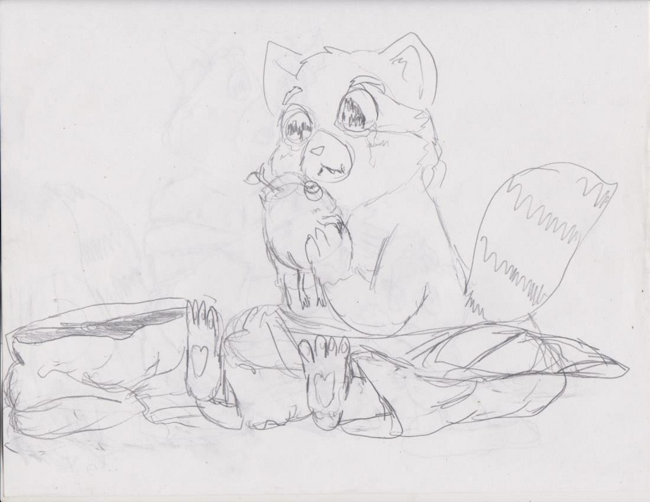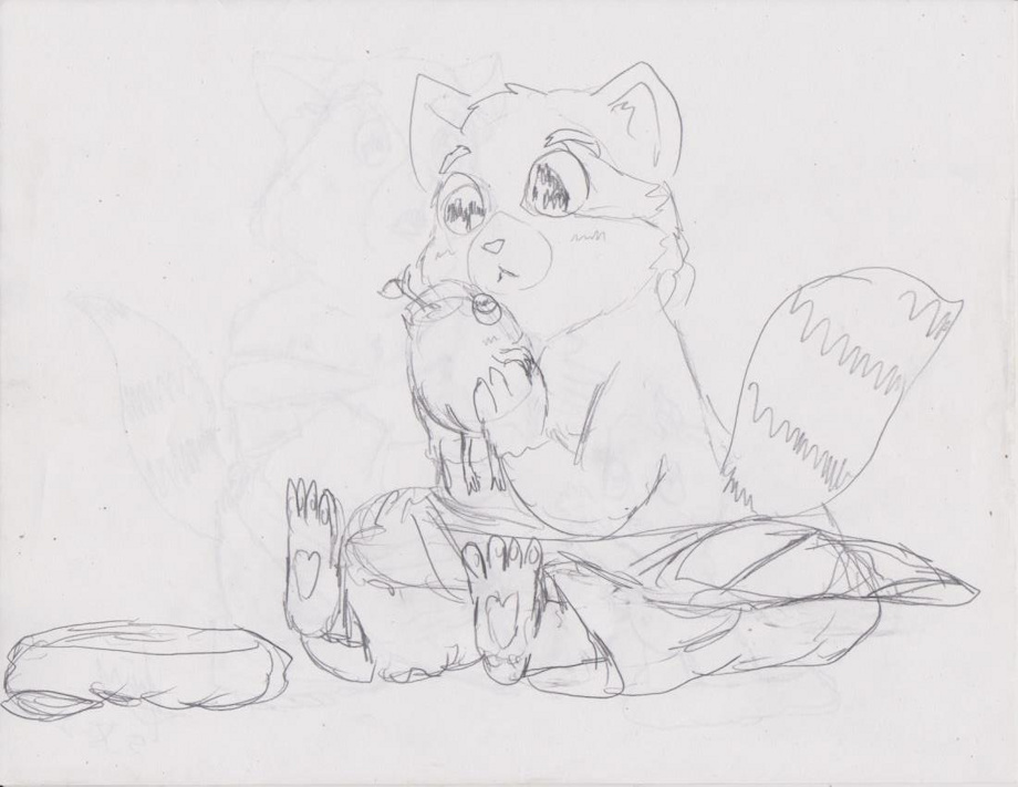 -5- The final image has Rocket become a baby and Groot has turned back into a seed. Rocket is sitting down with his formerly tight fitting outfit piled around him. He’s now so small his upper body is fitting through the neckhole of the jumpsuit, his body naked down to the waist. He’s cuddling the seed that was once his lover, Groot. The seed should be around the size of a baseball or moderately sized apple in Rocket's baby raccoon paws. The seed could have a little baby leaf or bud of a flower barely poking out of a crack on it, probably about to be swallowed up as the seed closes. Rocket is almost tearful as he hugs the seed to his cheek, watching Groot's final regression, perhaps fearing he’s going to be next. Rocket is a baby, so he has really big, shiny eyes and a head very large in proportion to his body. Baby Rocket's body is small and plump with little limbs and his fur is soft and short and fluffy.