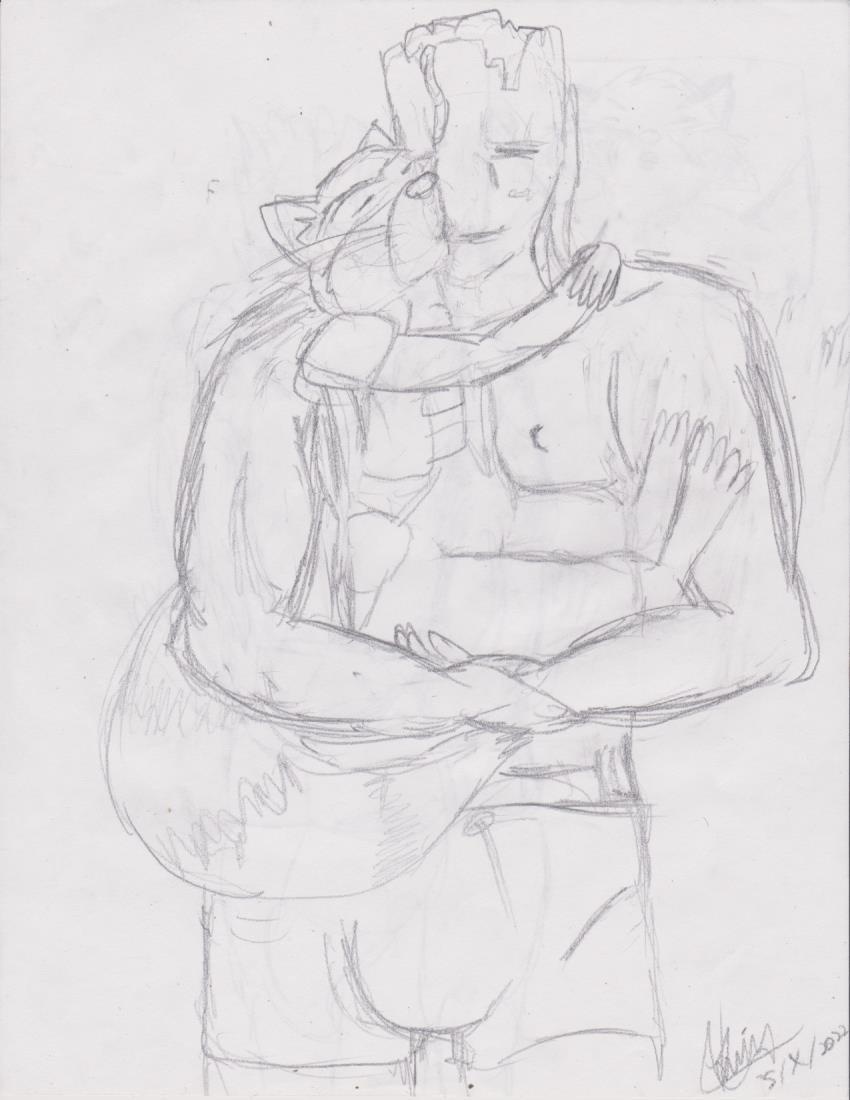 English: -1- Rocket Raccoon and Groot should start out in the first picture being very confidently in love. I would like them to be sharing an intimate, passionate kiss perhaps. Groot can be holding Rocket Raccoon so that Rocket can reach his lips, Rocket standing on Groot’s upturned hands and leaning in. Both could have their eyes closed in passion.