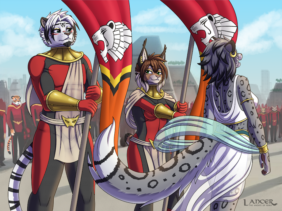Mika pulled some strings to get one of her friends placed on color guard duty. When the young knight found out he bemoaned it as a boring, tedious, and uncomfortable task. However, his feelings changed quickly when he realized just how close he'd be to the duchess of Bastet. A smile and winking glance from the radiant and beloved monarch would have him thanking Mika later.