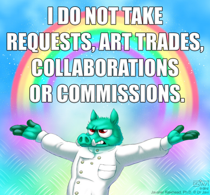 I don't take requests because everyone would want one and I'd have no time to do anything else. I don't take art trades because people never put any effort on their halves. I don't take commissions because people get really picky when actually paying for stuff, as they should. And I don't take collaborations because they are boring and unbalanced.