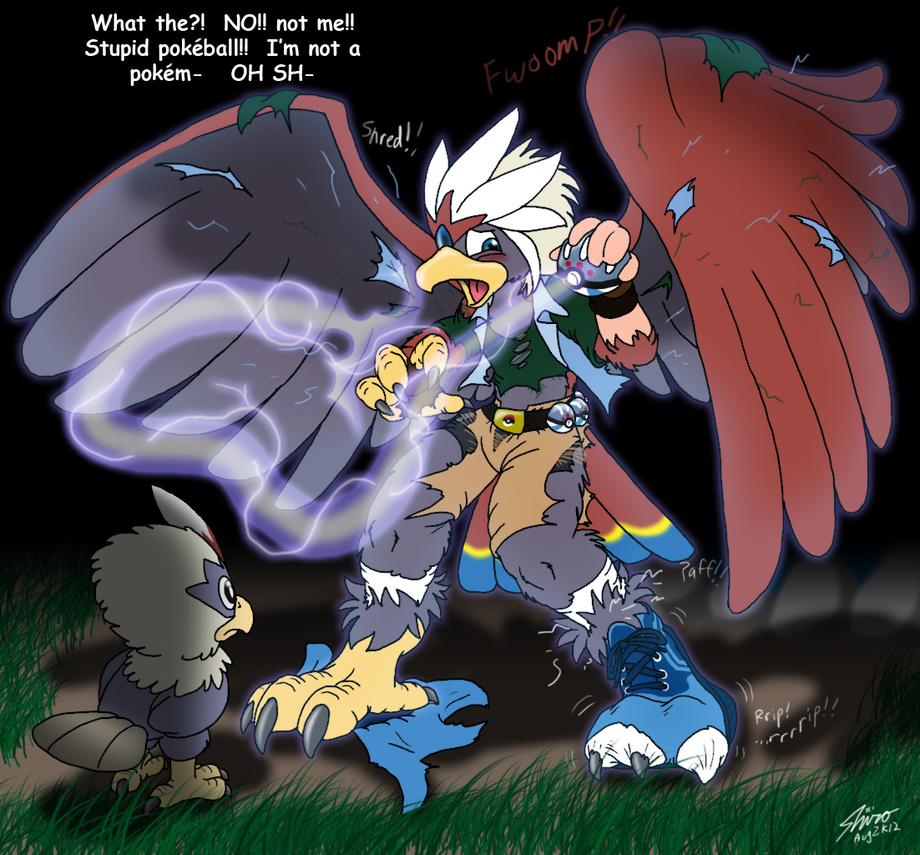 As an avid Pokémon trainer, I go out in search of Pokémon with a new experimental Pokéball. I find a Rufflet but no sooner do I try to capture it with my new Pokéball than it backfires and transforms me into a Braviary.