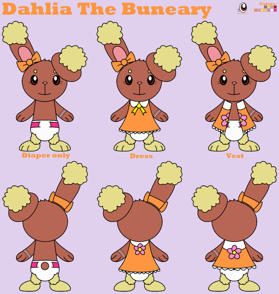 UPDATE 8/28/2023 12:26 AM: Added Updated sheet with addtions/changes for her dress & vest UPDATE 9/1/2023 12:20 AM: Added new Variant of Dahlia's Ref with her in Panties! UPDATE 4/23/2024 6:31 PM: Added a flower from her vest to the back of her dress. UPDATE 11/9/2025 6:42 PM: Changed her Diaper's Tape color from purple to Magenta. Model Sheet by
