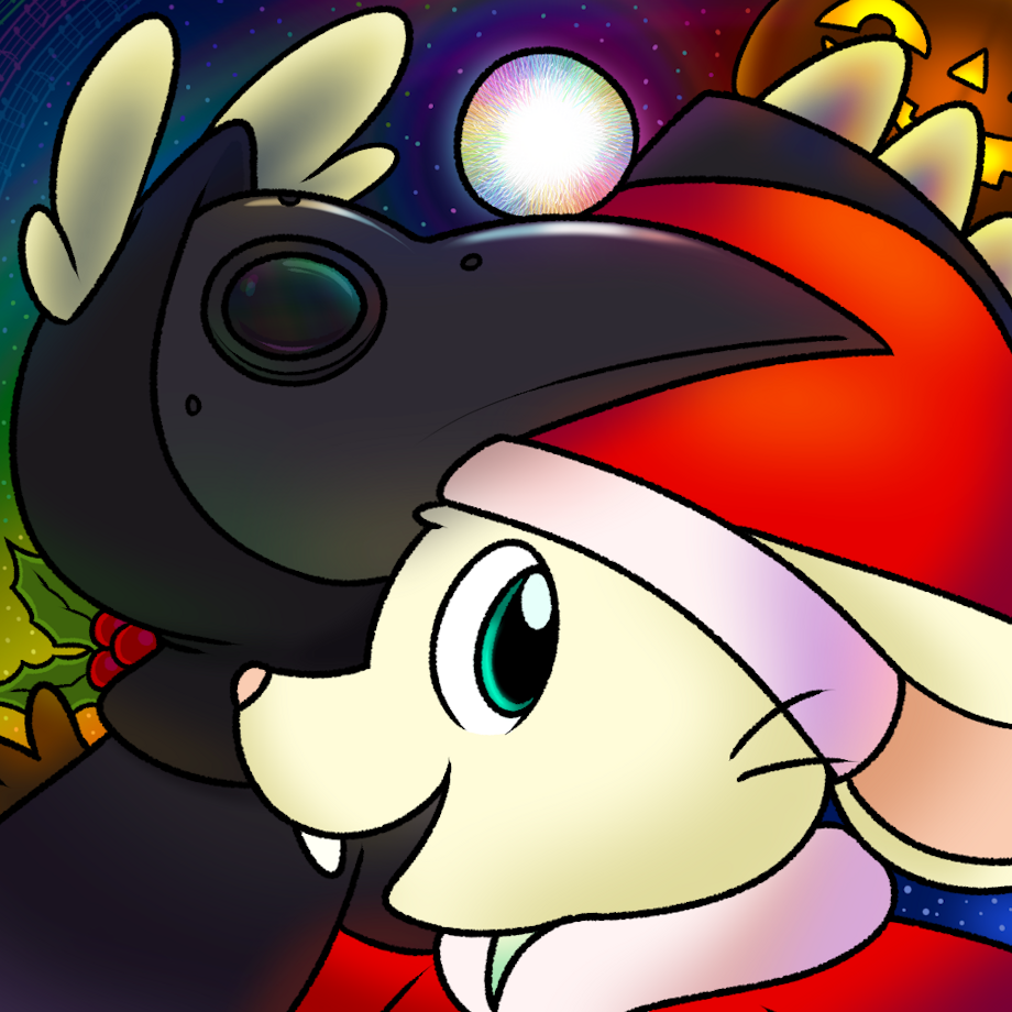Visual Description: Icon art with Owlnard and Oxnard together! Oxnard's in the bottom in a santa hat, and Owlnard is above him in his black plague doctor outfit. (a mask with a beak and goggles, and a dark cape and hood, but his owl brow-feather things poke out the top.) The design and hats and beak all curves circulator and mixed in rainbows and such!