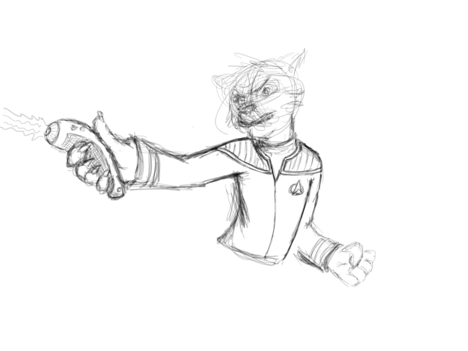 Felt like scribbling something... practice perspective or something, but I couldn't figure out how to make the pose dramatic enough... also, it was just meant to be his hand, signalling "Go!" or "Fire everything!" or something like that, but... god, hands... why did it have to be hands? -_-