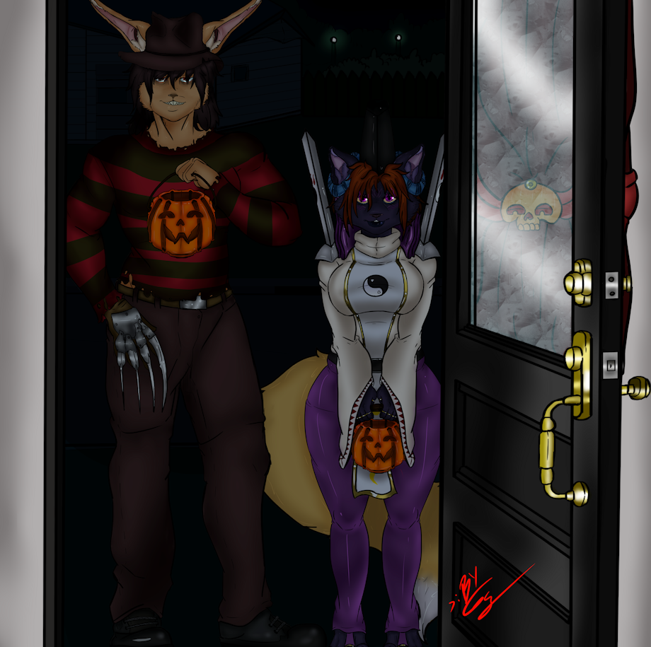 It's Halloween time! And since I'm Kali's partner and now happily married, I can't miss the tradition to going to each house to trick-or-treat on the occasion of this great date. Like every year, we always try never to repeat the costumes of each year, to always give it that freshness and originality that we always follow. This year I had to dress up as the fearsome Freddy Krueger and she as Taomon. And something I love about this artist who doesn't forget every detail of the characters portrayed, like the one that Freddy has a burnt look and he drew me with burn mark makeup. The end result as always, just great