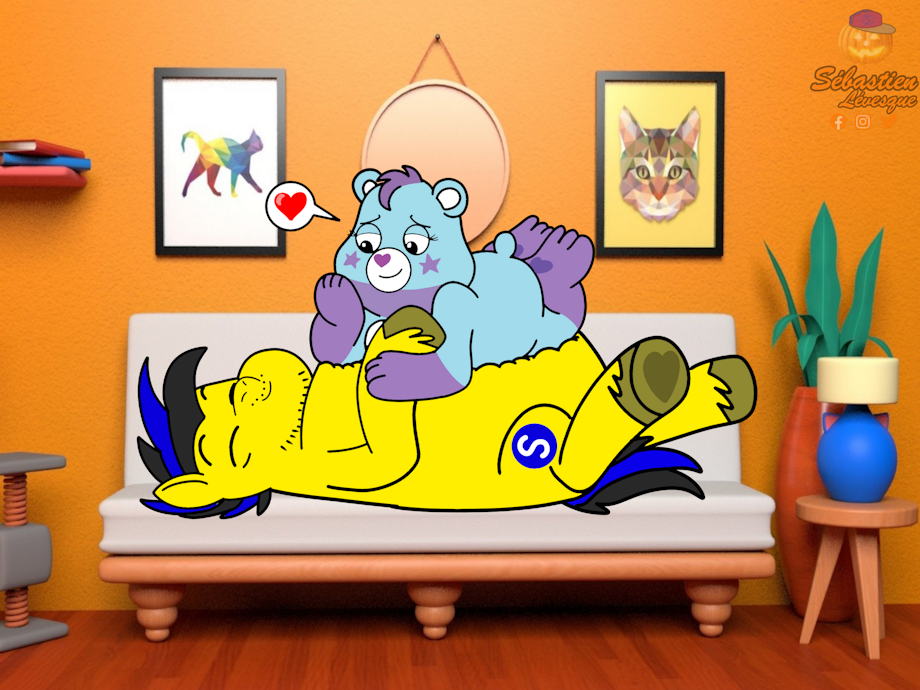 Here we see Dream Bright Bear, being in love, admiring the obese PonySeb 2.0 sleeping on the white couch, satisfied with his dinner meal, lying on his soft belly.