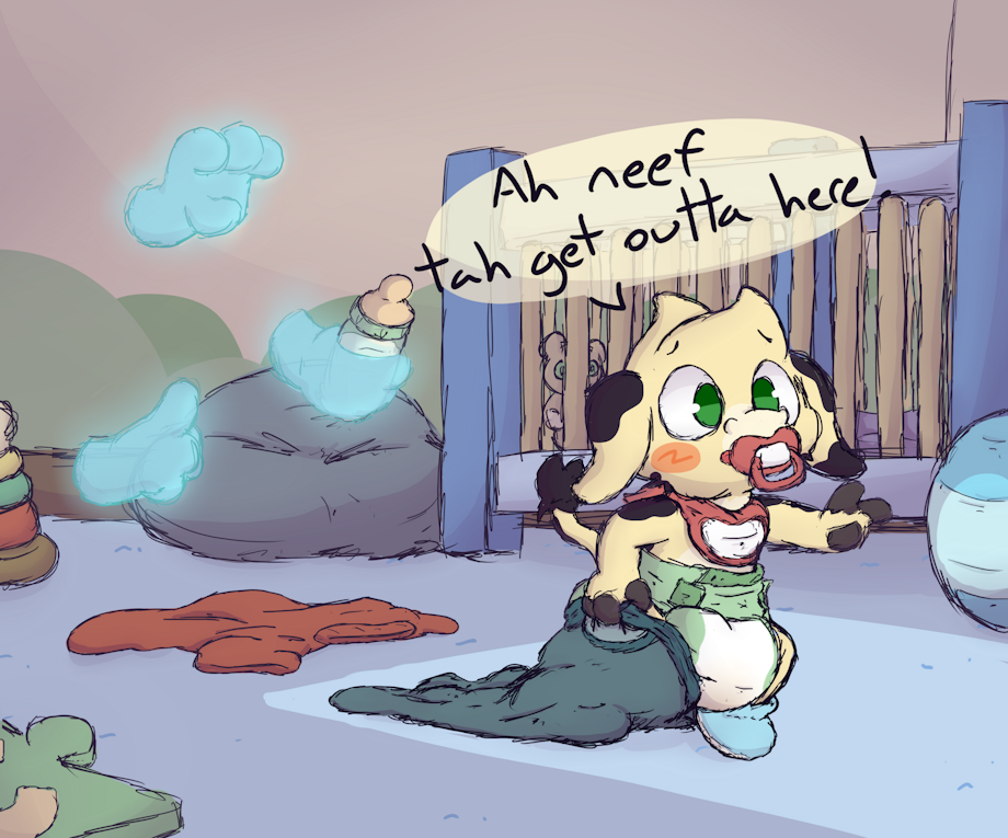 If he's able to get out his friends can help him change back? Or at least get a fresh diaper~