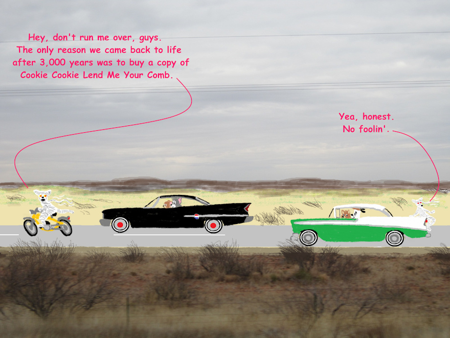 The appearance of these mummies are causing quite ruckus. They claim they only came back to life so they can buy a 45 record of Cookie Cookie Lend Me Your Comb...Like the mummy in the song link below. The Mummy by Bob McFadden https://m.youtube.com/watch?v=JC048zJHec8