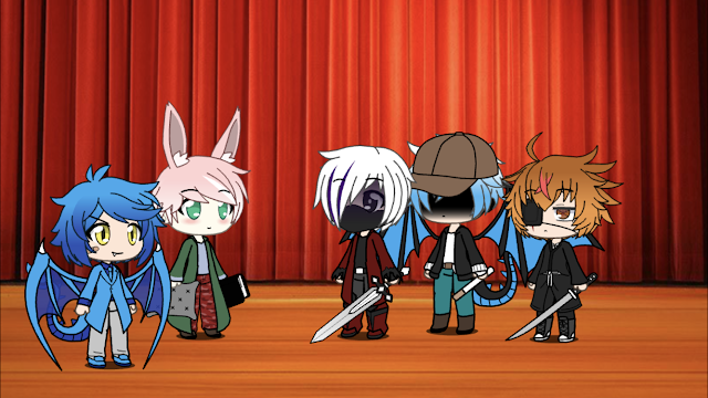 Here is a picture I made in Gacha Life of my OCs and their Halloween Costumes. From left to right: Celizrenta is a dragon vampire, Smokey is Arthur Dent from Hitchhiker's Guide to the Galaxy, the one in the mask is my Undertale OC named Reaper. He's dressed up as Dante from DMC. The one next to him is Motynth dressed up as Garcello from Friday Night Funkin' and the last one is my Pokemon OC Warilla dressed up as Ichigo.