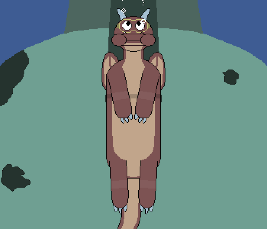 This dragon guy's having a good time diving and exploring a shipwreck, but he's resting right now, laying against the mast and watching his bubbles float away.