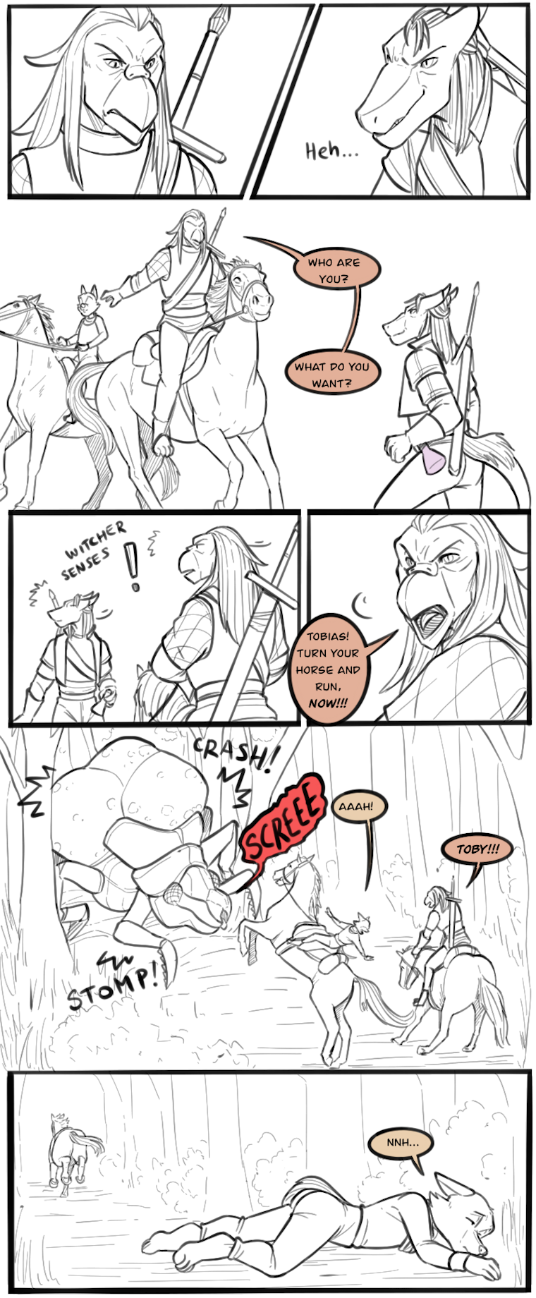 The way you start this sequence is so good. Setting up the scene with Marcus and Tobi first, then creating that sense of speed and rushing with McStabby. Love the detail of the potion at his side and the way you do him so fluidly, too, it's really well done.