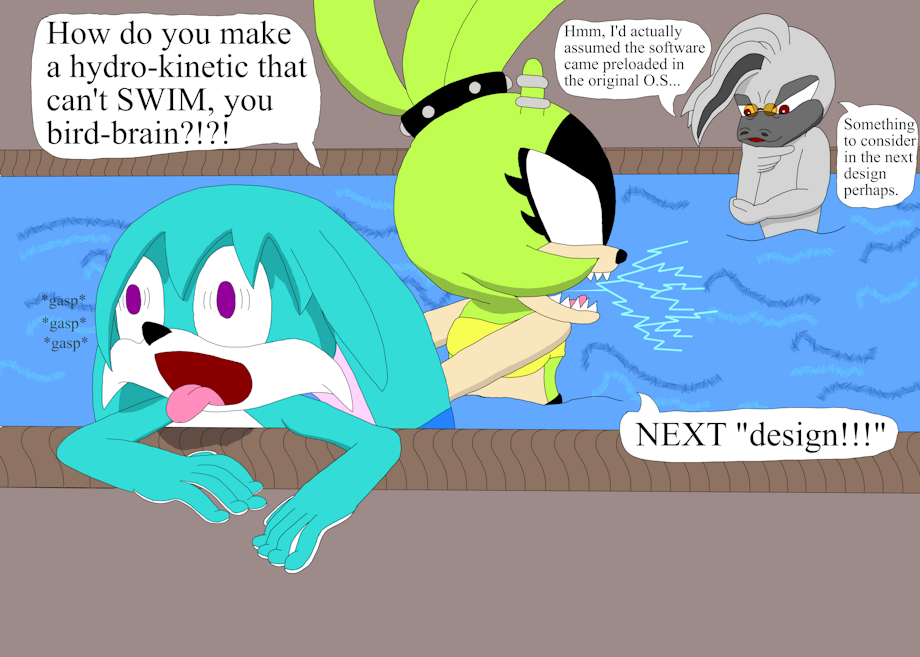 As part of their training, Dr. Starline needed to see how his creations handled a water dominated environment. While Surge managed to carry herself admirable, it appears Kit suffered something of a setback. Well, fennecs are desert dwelling foxes.