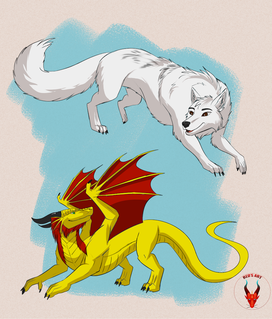 Hatched at a near exact same time (different eggs. Yes, the wolf was hatched from an egg) the two brothers have rarely been separated. And if so, not for long. Even sleeping together in the same bedding. If you see one of them, the other is not far behind (or is likely behind you). They never seem to fight or disagree with each other, can read the other brother like a book, and cooperate near perfectly with one another. Creating quite the series of stunts using one another as leverage, height, or even launching one up into hard to reach places.