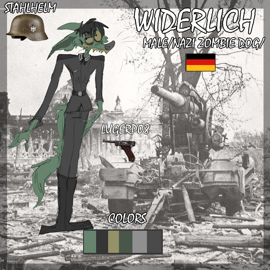 Some undead fucking failed nazi experiment went wrong. His eyes are a dull yellow. He's got snot green fur. his tongue is like a rotting pickle. His eyes are always wonky and not lined up.