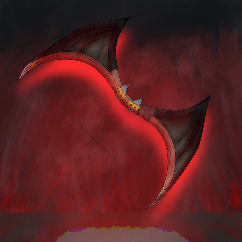 Maybe it's because I should have gone to sleep and I am completely tired, but let me tell you a little bit about this bow that I began to develop as I conceptualized the design. By some inexplicable means, one can summo-er, come into the possession of the "Demon Bow of Myotis", myotis being a type of bat. Yes, it is plainly obvious that this bow has bat wings, but they aren't just aesthetic -- well, kind of. I envisioned this demonic bow as having dynamic abilities. If you notice, the wings are not made of wood as is the rest of the bow, but rather the wood of the bow transitions and becomes the flesh and fur of the bat wings. The tips of the wings by the joint are the only thing not made of flesh though appear to be sharpened bone that can be used to slash and stab enemies at close range. Similar, the bow itself is adorned with iron spikes around the grip of the bow (indicated by the leather bracing) made to resemble fangs and blades at the tips of the bow -- again, should the wielder find themselves too close for comfort and need engage in close-quarters combat. Of course, being that the wings are that of a living... demon... bat-creature, the most unique feature (I think) of the Demon Bow of Myotis is that the wings fold and close when the bow is away and reopen when the bow is held and equipped. Also, I imagine anyone hit with this bow is affected with a drain-life or life-steal enchantment, healing the user. I didn't know what to do for an arrow, so this is like a Terraria bow: the effect works with any arrow and is tied to the bow itself.