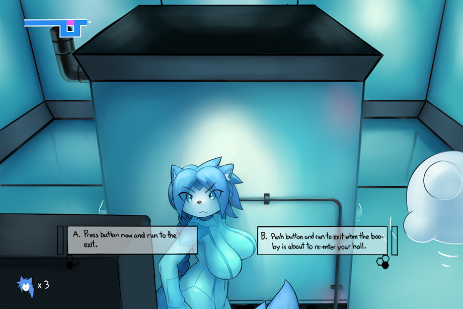 'A chilling vision played out in your mind's eye when you considered pushing the button, so you decide to wait another second. The bluff worked and the booby turned into the other hall. You can see the being's position on the monitor up on the wall.'