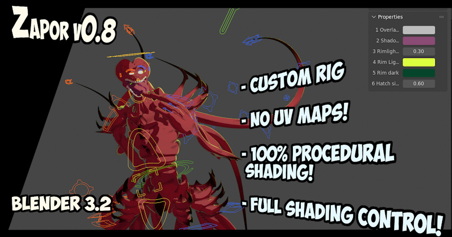 This character a 100% procedural shading, which totally controlled by "Light control" bone. You can choose shadow color, total tone, rim lights on light and in shadow sides separately, and size of hatching. Scaling of this bone will control of amount of taked light.