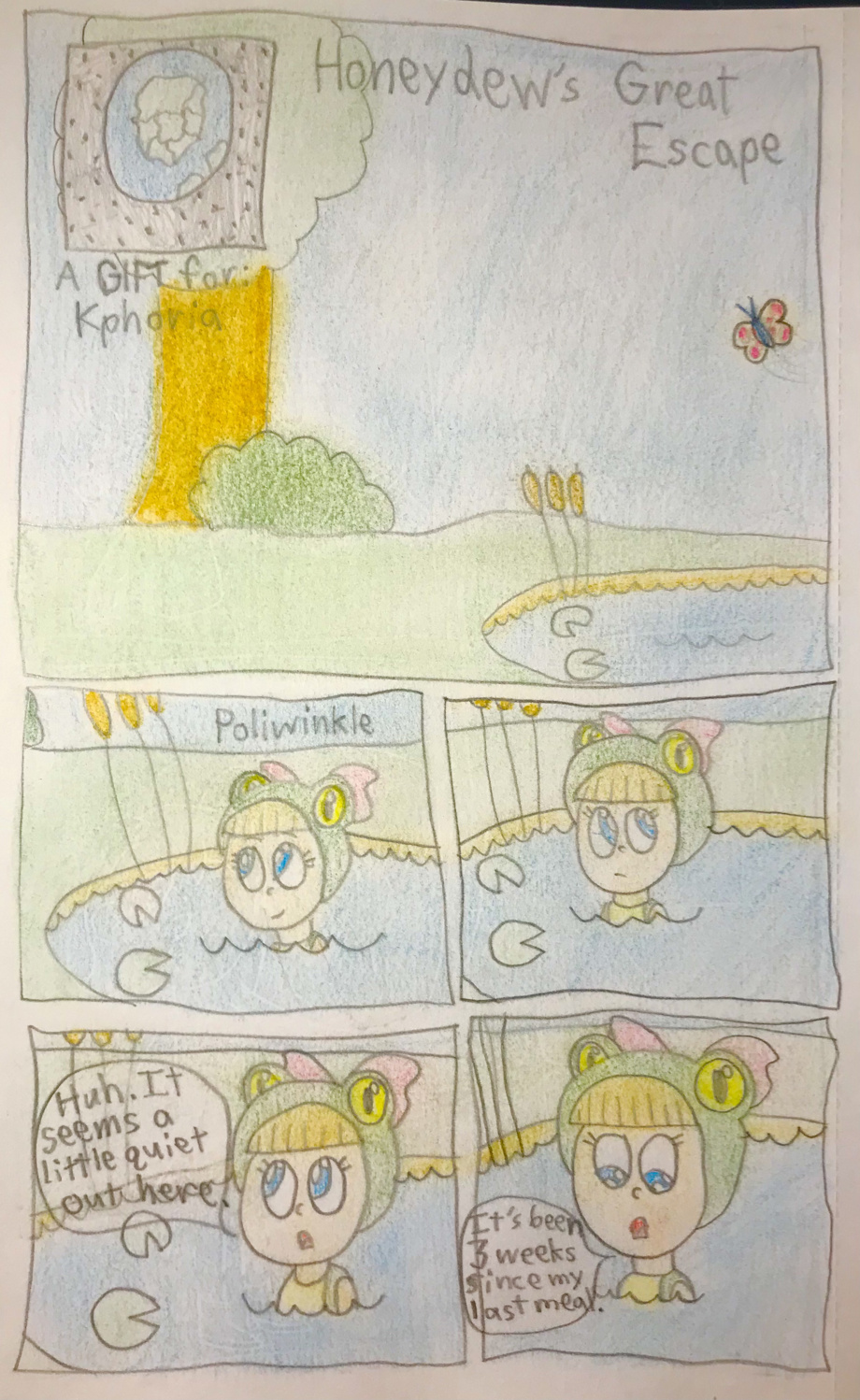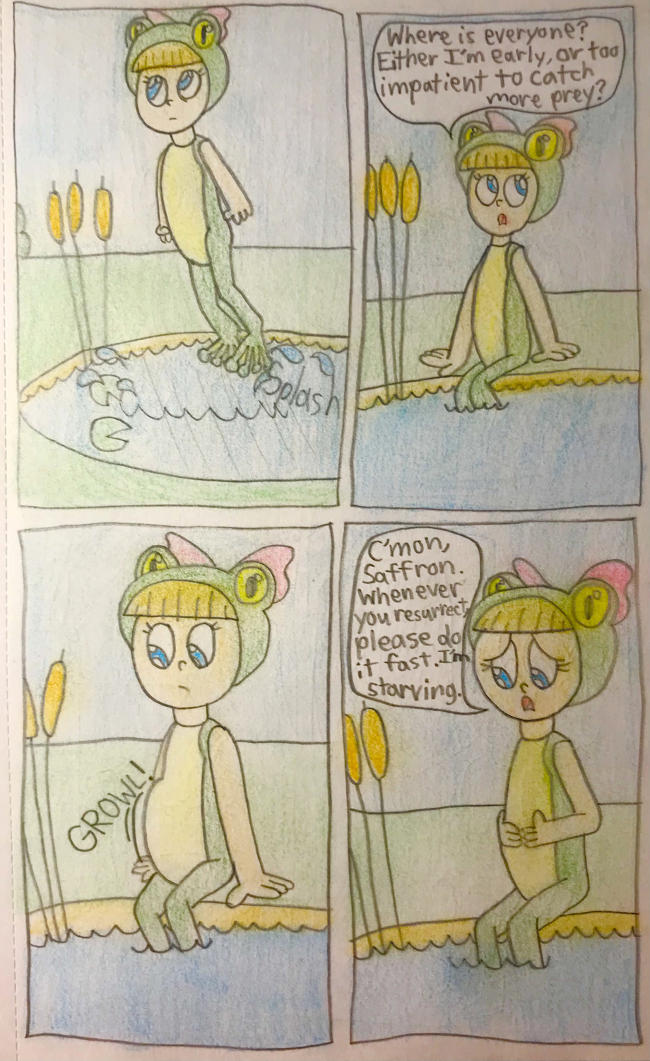 Basically Poliwinkle hops out from her pond, waiting to catch some bugs. But there isn’t any.