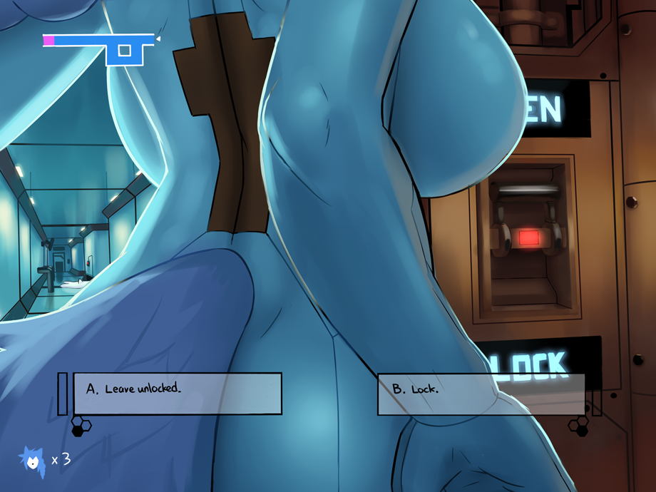 You wait five seconds and the exit door opens. You enter a small intermediary room. You can lock the door behind you so it can only be opened from this side. The stranger you met earlier would have to stay put until someone comes back to rescue her. But part of you feels you should not trap her here.'