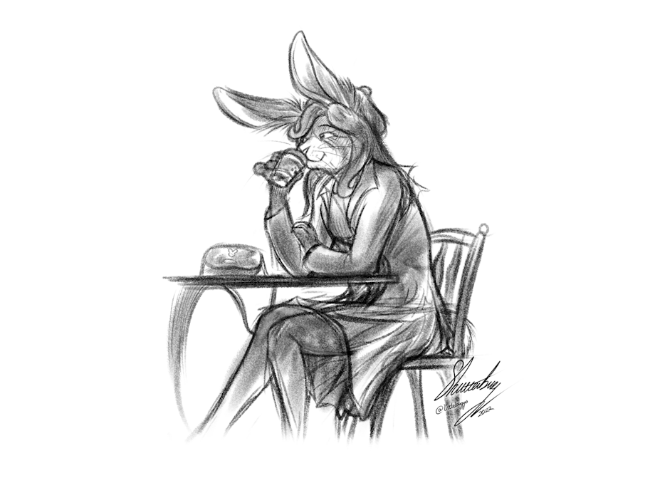 Sketch of Mimi enjoying a hot chocolate at her favorite cafe.