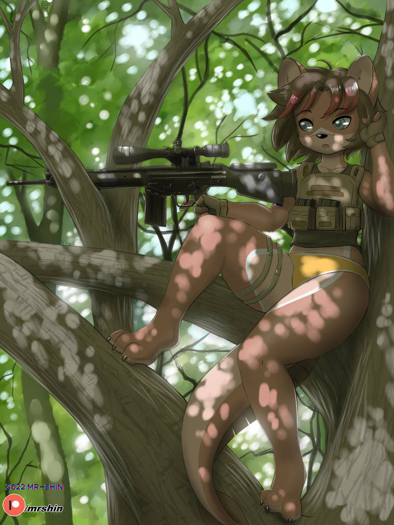 body armor is a good choice but id go a step further and have a slash proof neck protector as well, if its war there might be experts with a knife and the throat is the most dangerous area to be stabbed. she has grip gloves on so it should help keep a good hand on the weapons even if her hands get sweaty or muddy it will especially be helpful when it rains and her hands and the weapon get wet.