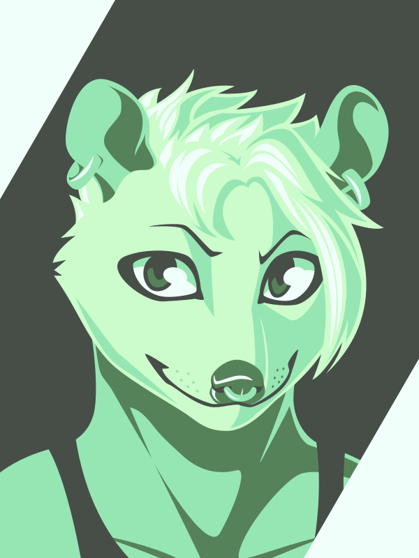 [A vector portrait of an anthro wolfdog with facial and ear piercings, drawn using 5 flat colors - black, three shades of purple-pink, and very light blue]