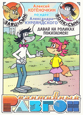 the comic is called "Jet acceleration" At the top it says "Alexey Kotenochkin according to the idea of Alexander Kurlandsky" Around the hare-punk is written "Hare son". Around the wolf nerd is written "Wolf son". The good wolf says to the Fox, "Let's rollerblade!"