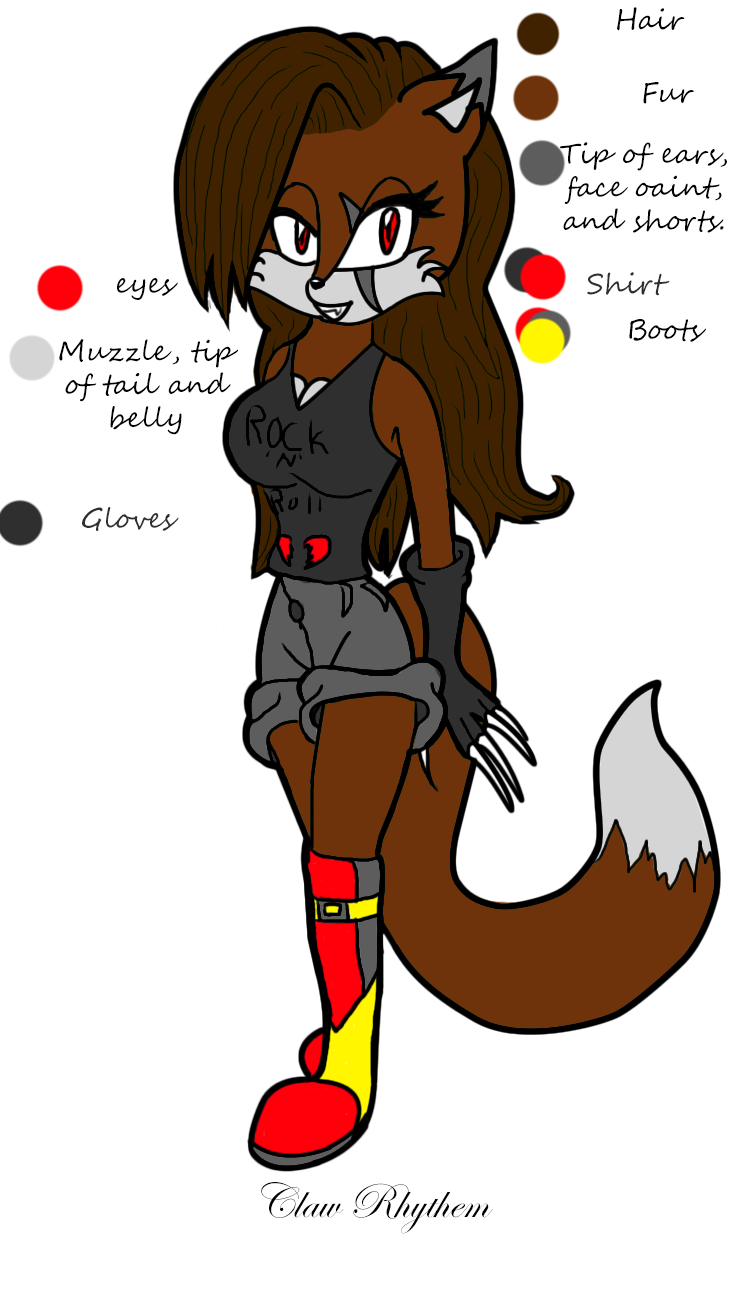 Claw has brunett hair, hazle colored fur, grey fur on her muzzle, the end of her tail, the tip of her ears, and across the eye (making it look like a scar), and red eyes.