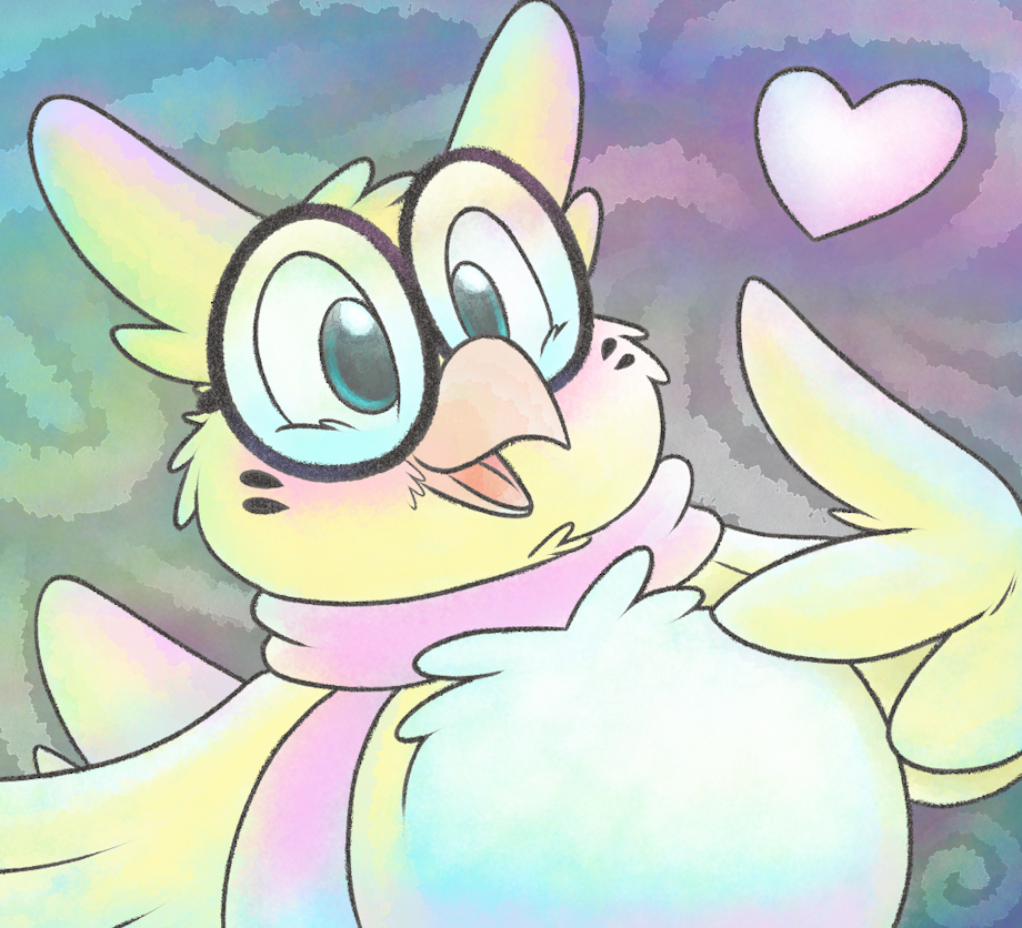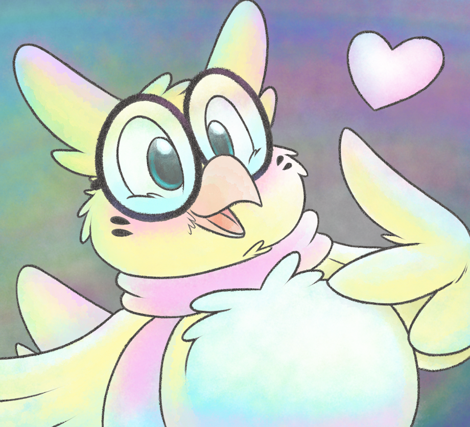 Visual Description: Same art from yesterday but colored! Thinner lines with some pencil look to it, and some water-colory shading - Owlnard is very cheery in a pink vest, giving a sort of sideways peace sign with a little white heart floating above his wing - he usually looks tired but here he's very perky and happy. The background is gray with faint rainbowy colors, and white watercolor that makes it look slightly metallic!