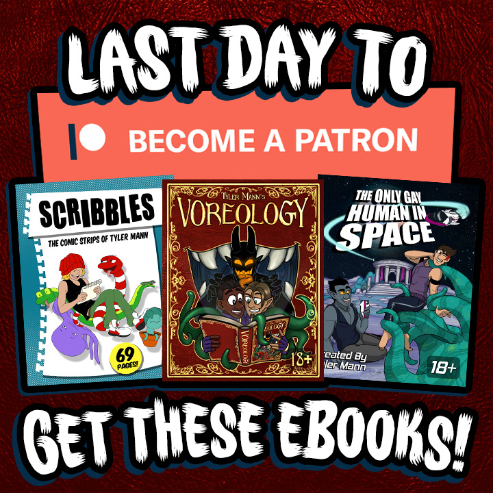 https://patreon.com/tylermannart Today is the last day to get 3 eBooks of SFW and NSFW comics on my Patreon! Whoever sticks around past Dec 15th will get a personal download link to my three new collections of comics! More than 200 pages of vore, tentacles, gay stuff and more!