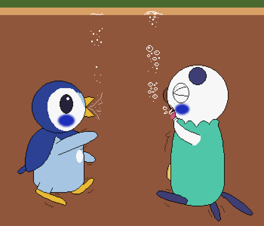 A piplup and an oshawott both claimed to each other that they could safely swim in quicksand (Despite never trying before), and they decided to see who was better at it. Hopping into a pool of it, it wasn't long before they realized how much harder swimming in quicksand was than simply swimming in water, and both pokemon soon sank underneath. So exhausted from struggling to swim, neither could hold their breath anywhere near as long as normal, and their fearful whines turned to pained gurgles as they both started to choke, first the piplup, then the oshawott.