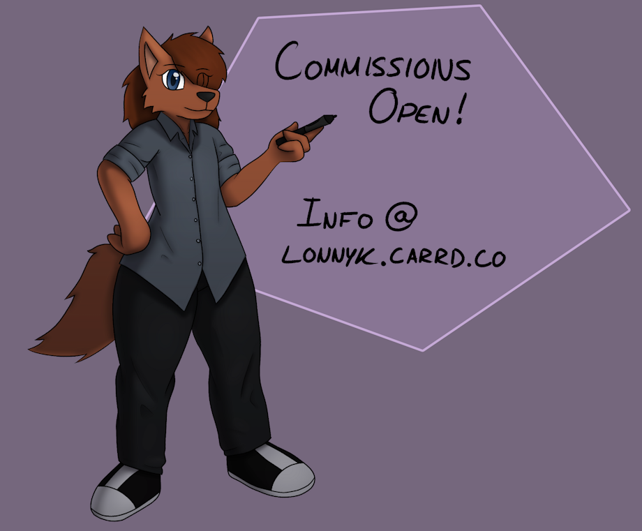 I'd like to announce that I am once again open for commissions! Need a last minute Christmas gift? My turnaround times are usually a week or less so I can have your piece finished up before the holidays! Information for commissioning me is available at lonnykcomms.card.co