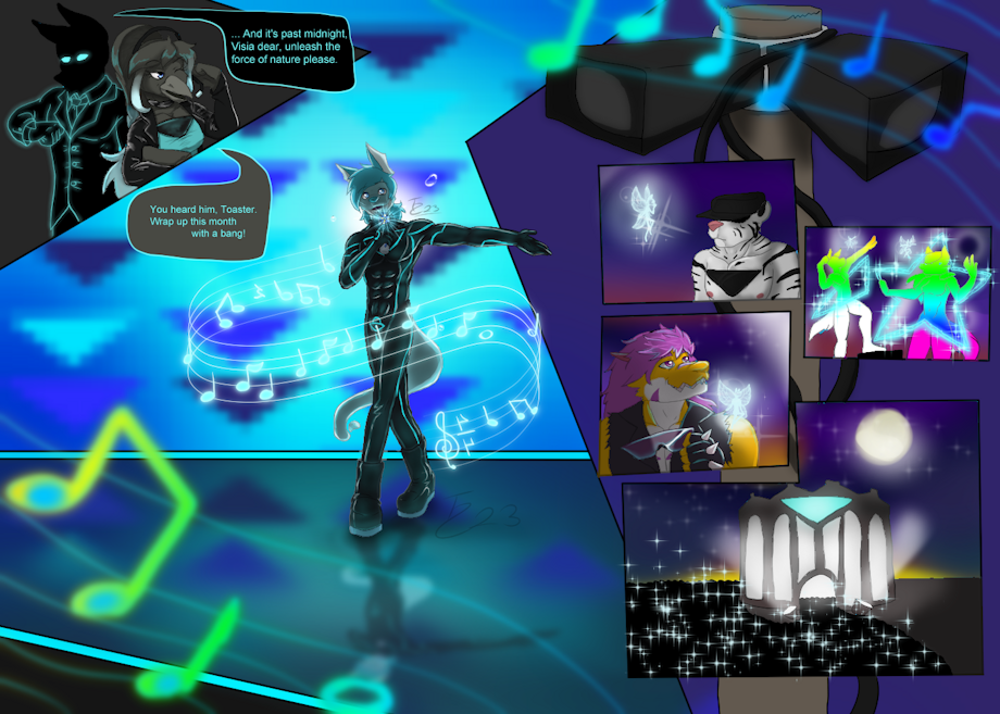 The stadium reconfigured. The stage no longer for a punk's rock concert, but filled with cyan lines and rainbow patterns. The jamming punks and thugs stopped for a moment. Those left free from Kai Tyde's snare could see the Water Mage in a thermium suit. Fireworks erupted in the sky. and music filled the world. Not a hypnotic one, but one to touch them