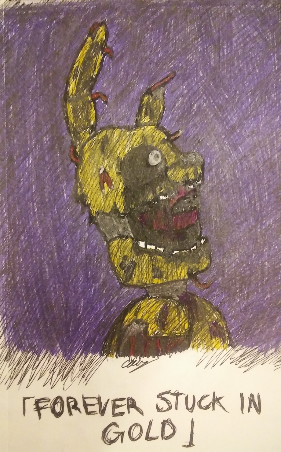 The line "Forever Stuck in Gold" and the title "Springtrapped" are inspired by this amazing FNAF 3 song by Groundbreaking, I absolutely adore the concept that William Afton/Springtrap is miserable and remorseful of his actions... though I still adore him being down for more murder like he is canonically, I could go both ways on that honestly
