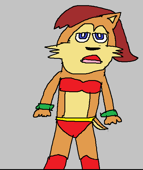 Super Squirrel is captured, put in Krytonite shackles and with her shirt and cape removed, leaving her in a bra, her tights, and boots.
