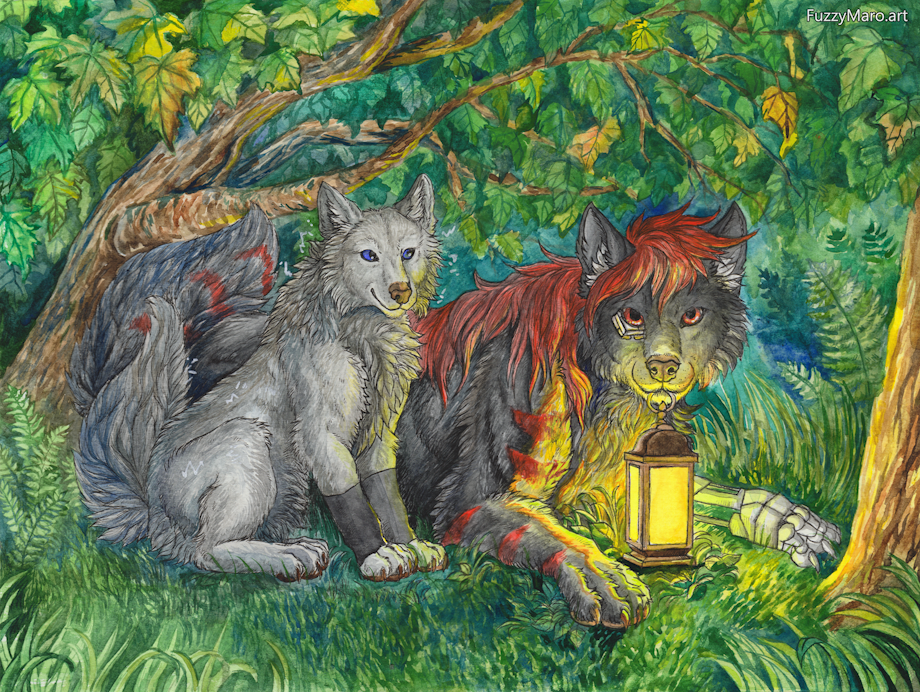 One of my most detailed watercolor arts! When I was a kid I used to sit under a big maple tree with my friends and talk about pokemon and lions. This work started to remind me these times after I started to paint leaves! Characters belong to Redsparx