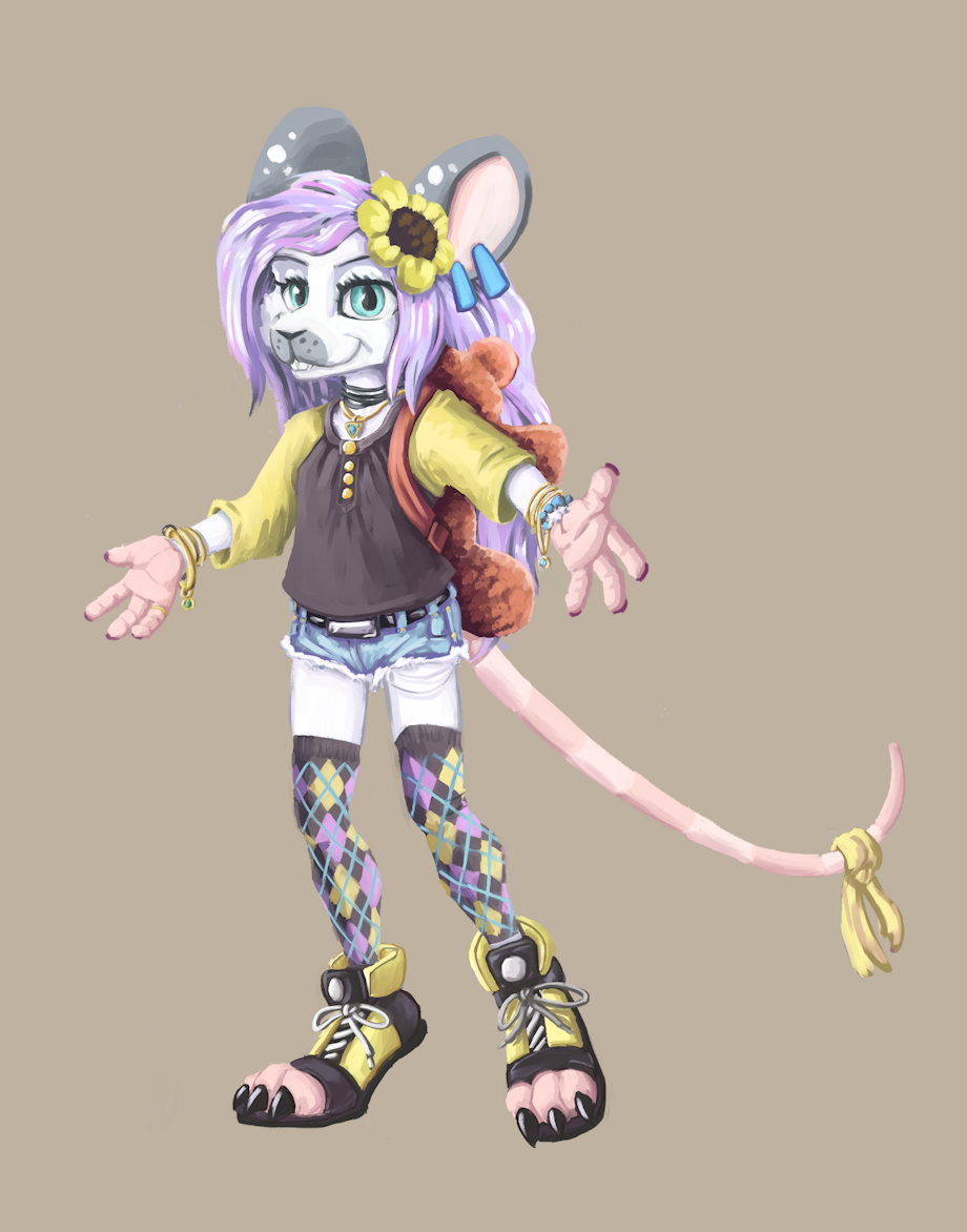The backpack is a fun detail from another piece (a future reveal~). An element of her personality is that she puts a little more emphasis on looks that she probably should. (And being SEEN at all for that matter, which can be a challenge.) That backpack has enough stuffing to hold a plushie shape, so you know it can't fit any serious textbooks. It's mostly her pencils, paints, and a sketchbook inside.